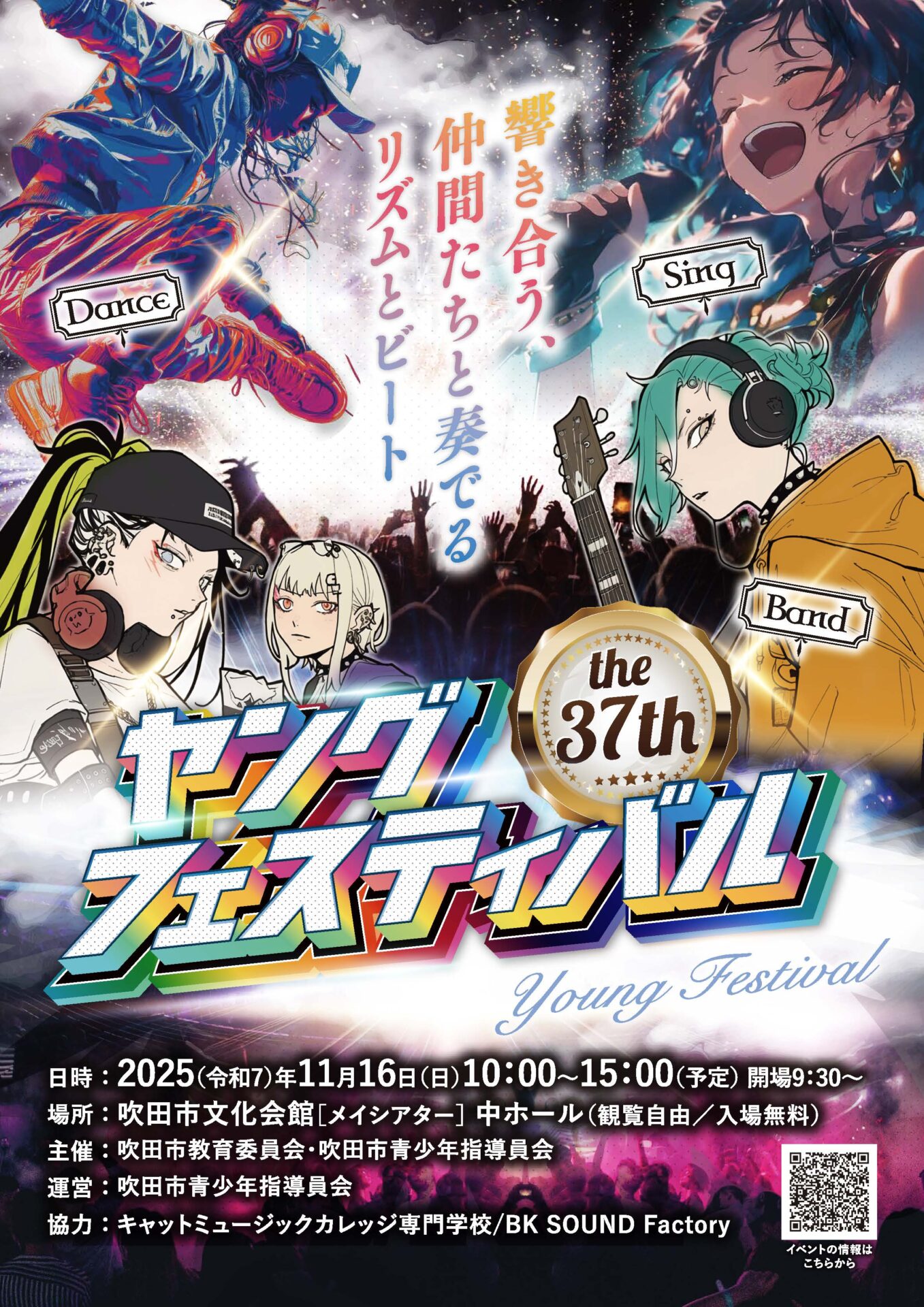 11月16日はメイシアターへ、第37回ヤングフェスティバル開催! お知らせ 2025.10.30 令和 7年11月 16日(日) 10時~15時(予定)吹田市文化会館(メイシアター) 中ホール今年も吹田市内のアマチュアダンス・バンド・ボーカルの祭典、第37回となるヤングフェスティバルを開催します!! 出演団体数も多数のお申し込みをいただき、フェスは盛り上がると思います。観覧は自由・入場無料ですので、是非メイシアターにお越しください 令和6年度のヤングフェスティバルの様子は、↓こちらからもご覧いただけます。 第36回ヤングフェスティバル開催2024年11月17日 吹田メイシアター中ホールにて今年度もヤングフェスティバルが開催されました。その時の様子をご覧ください今年度はバンド11組とダンスグループ6組の参加がありましたそして当日ご来場いただいた観客の方々は700名参加していた...